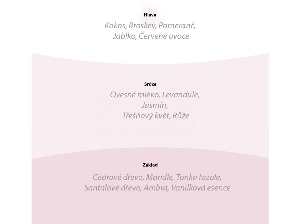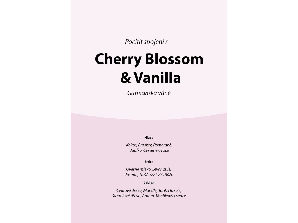 Něžné třešňové květy se snoubí s tóny vanilky, pomeranče a mandlí. Vůně přináší sladkou, jemnou a uklidňující pohodu.