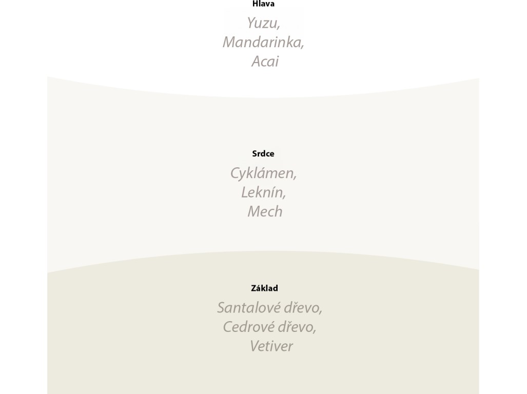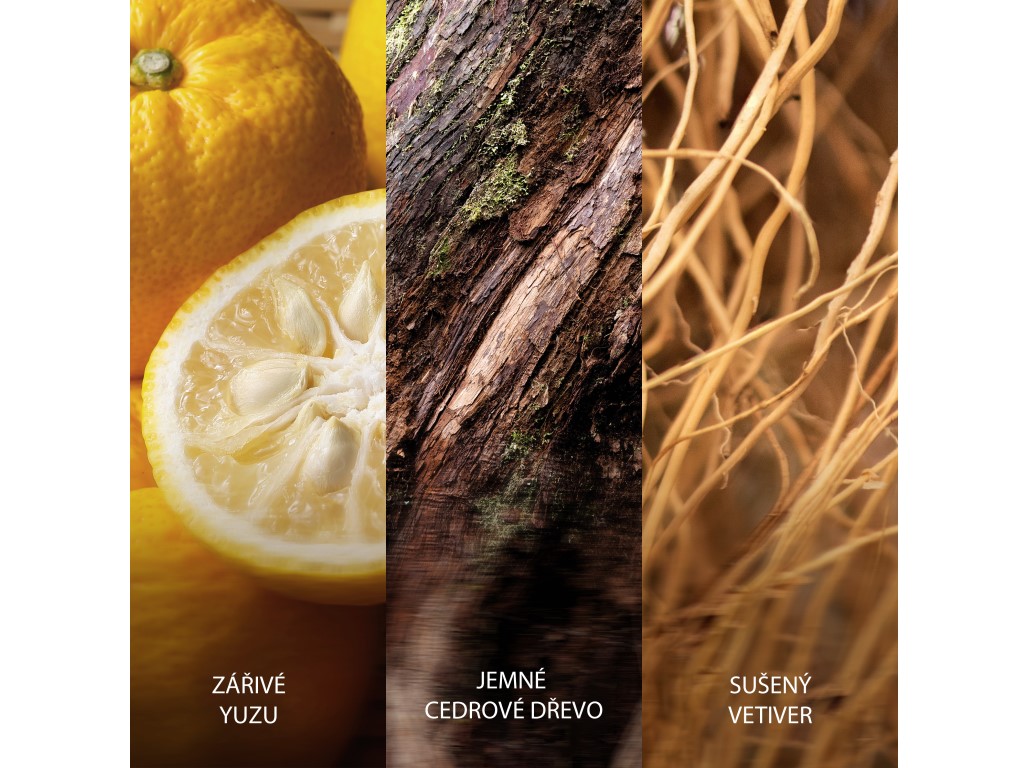 Jiskřivá vůně yuzu se snoubí s jemným cedrovým dřevem a sušeným vetiverem. Přináší svěžest, lehkost a dřevitou harmonii přírody.