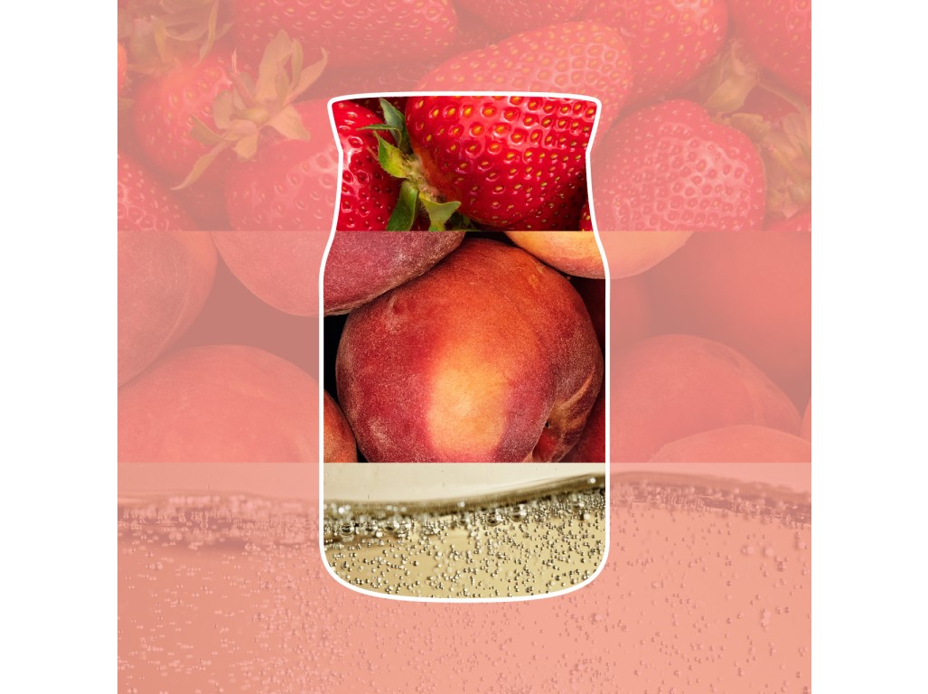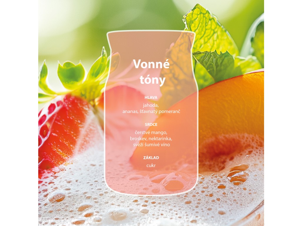 Šťavnatá jahoda, ananas a pomeranč tvoří svěží ovocný úvod. V srdci se snoubí mango, broskvový nektar a tón šumivého vína, zatímco jemný cukrový závěr dodává vůni hravou sladkost a radostný charakter.